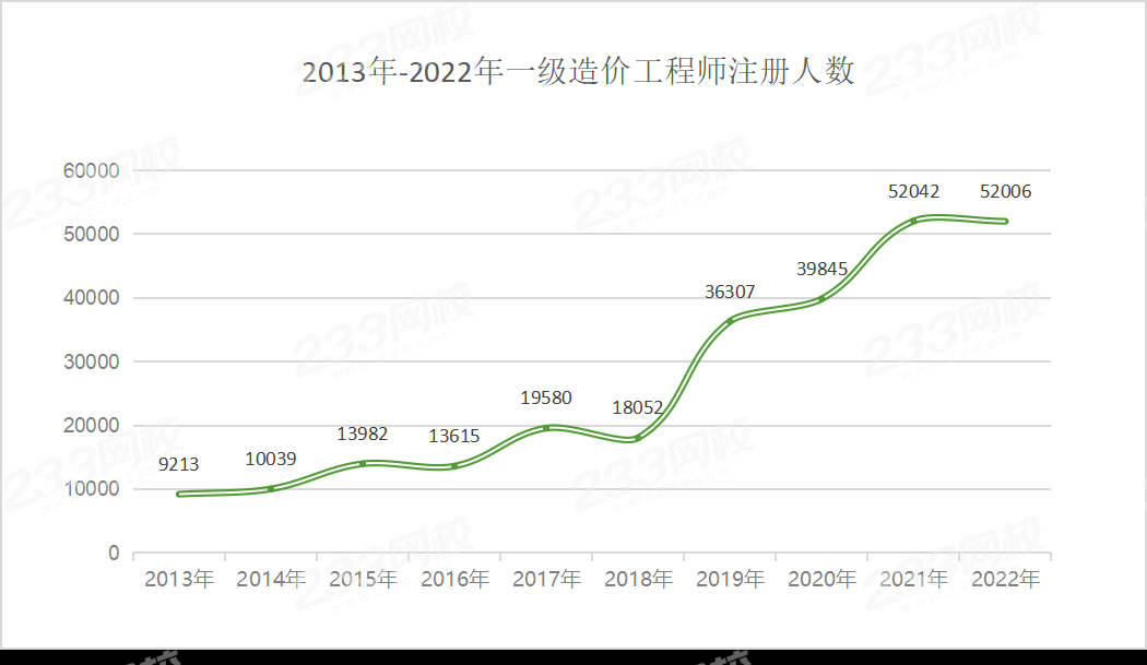 从住建部统计的2008-2021年造价初始注册人数237182人,加上2022年注册人数52006人,2008年-2022年一级造价工程师注册累计人数达287602人,下面学霸君统计了近10年来(2013年-2022年)一级造价工程师注册人数变化情况,详情见下表: