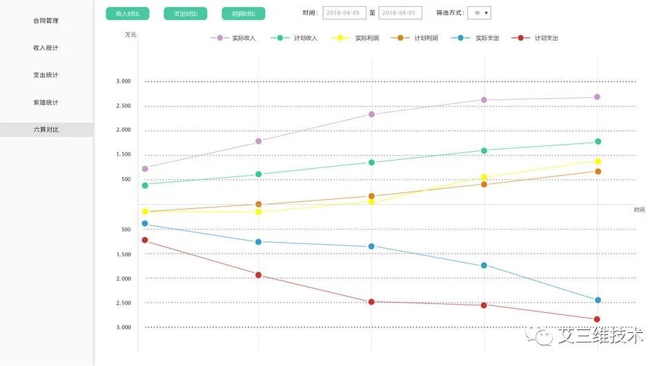 2)收支管理:进行计划、实际收支利润的六算对比,分析工程的收支趋势,提供工程项目的实际价值收益情况分析;