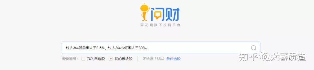 打开i问财,输入筛选条件:过去3年股息率大于3.5%、过去3年分红率大于30%。