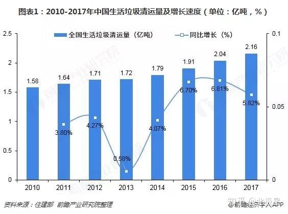 随着人口增长以及城乡一体化脚步的加快,城镇人口越来越集中,生活习惯和环境均有了较大的改变,而伴随而来的还有越积越多的生活垃圾,生活垃圾处理成了和我们生活息息相关的事情。根据中国住建部2018年发布的《中国城市建设统计年鉴》数据显示,2010年以来,我国生活垃圾清运量逐年上升,2016年超过2亿吨,达到2.04亿吨,同比增长6.81%;2017约达到2.16万吨,同比增长5.82%。