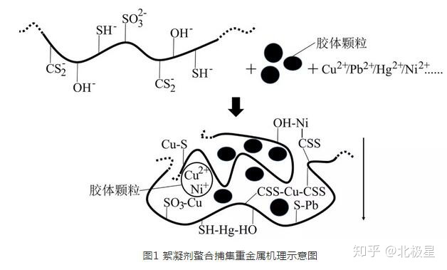 絮凝剂针对重金属离子的去除主要表现在吸附与螯合作用,其中螯合沉降是絮凝法去除重金属的重要途径,其机理示意如图1所示。选用具有重金属螯合捕集功能的絮凝剂尤为关键,携带有-CSS-、-COO-等负电荷基团的絮凝剂可与重金属离子按照一定的物质的量比形成螯合物来达到去除重金属的效果。絮凝剂通过自身的吸附作用,将各螯合物“架桥”牵连聚集形成微絮体,而絮凝剂本身具有优良的网捕卷扫性能,有助于微絮体形成更大的絮体,加速沉降。同时,高分子絮凝剂具有稳定性强、适用范围广以及沉降性能好等特点,作为重金属螯合捕集絮凝剂时,其母体大分子链的稳定性在一定程度上遏制了螯合物的再离解,有效保证了重金属离子的去除效率。