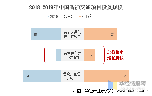 据公开资料,2019年智能交通市场亿元中标项目中智慧停车类项目为7项,比2018年增加了4项,增速最快,市场规模净增7.65亿,同比增长31.4%,为2019年整体过亿项目同比增长率贡献了26%。
