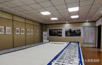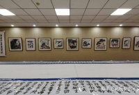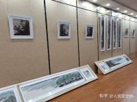 此次艺术展共展出两位艺术家近年新旧书画篆刻作品共计81件,重点再现李剑斋先生合肥展中临习《毛公鼎》、《散氏盘》巨幅长卷。十余米长卷横呈画院一楼巨大的画案上 ,尤为壮观,气息高古,章法有致,浑穆苍茫(安徽书坛泰斗张良勋赞评)。 一楼展厅右侧一字整齐展示剑斋先生篆刻作品二十枚放大装框的印蜕。剑斋刀笔游弋浙皖间,汲缶翁雄浑,白石快利,时见高古豪迈,朱迹纵横,白文斑驳灿烂,正大气象。展厅左侧集选十余幅剑斋先生合肥、.上海展山水花鸟书法小品,兰竹、荷花、奇石,寥寥数笔,妙趣横生,在枯墨浓淡里,在纯粹简朴中,写意着他对传统笔墨与创新的理解。最为可观的是画案正对面展示着剑斋近期创作两幅六尺整张荷花和雪山题材大画,荷花满纸,墨气淋漓,八大、苦禅、如琢笔墨精神再现。雪山图指笔通会,正如剑斋先生诗意“最喜千山忽飞雪,莽莽苍松雾茫茫”, 苍松似虬龙若飞,雪花飘飘,雪山苍穹相接,唯余莽莽,雪溪澄净,雪屋树间,高士可点,围炉诗话。整幅画墨韵浓厚,层层积染,真气弥漫,令观者难忘。