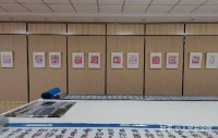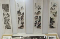 展厅对面展示陈玉婷女士十幅山居小品图,各俱风神笔精墨妙,色彩明丽雅致,寓实景于写意,树色春秋变幻,远山层叠,几间老屋,几点人物,栩栩如生,一派山里人家生活t气息让观者- -眼便梦回儿时山村记忆,印象深刻。陈玉婷女士-组四时山水条屏 深得虚谷神韵,用笔苍秀奇拙,墨色清新,色彩隽雅,画中人物娴静可爱。更可观可赏的是其表现春夏秋冬四季传统山水四条屏深得黄君璧大师笔墨精神,笔墨氤氲,笔法苍劲,色彩烂漫,画境雄阔。