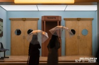 更有趣的是售票亭身后的两扇假门。门上开出的圆窗被装上了单面镜,当门外的人好奇地凑近,想要看看门内的世界,却只看到街景与自己的镜像,殊不知另一侧的世界正在观察着他们,而展厅真正的入口则是藏在一旁不起眼的隐形门。