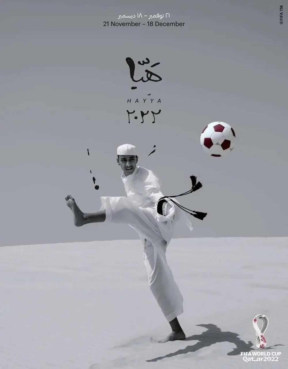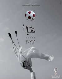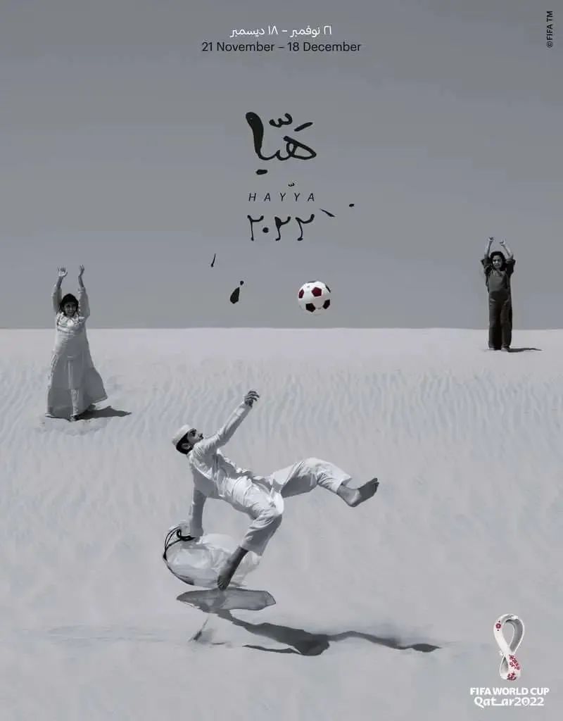 七幅配套海报描绘了阿拉伯地区对足球的热爱,以及足球所蕴含的家庭团聚这一特别意义。主海报呈黑白调,一位男性将传统头饰抛向空中,作为一抹亮点存在的足球,则呈现出卡塔尔标志性的栗红色。