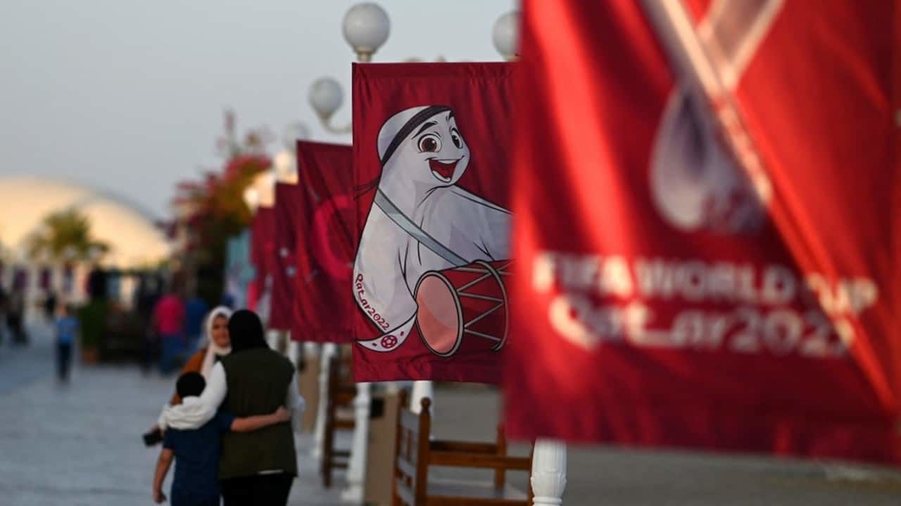 今年世界杯的海报由卡塔尔女艺术家Bouthayna Al Muftah设计,创作主要灵感来源于群体记忆的概念。