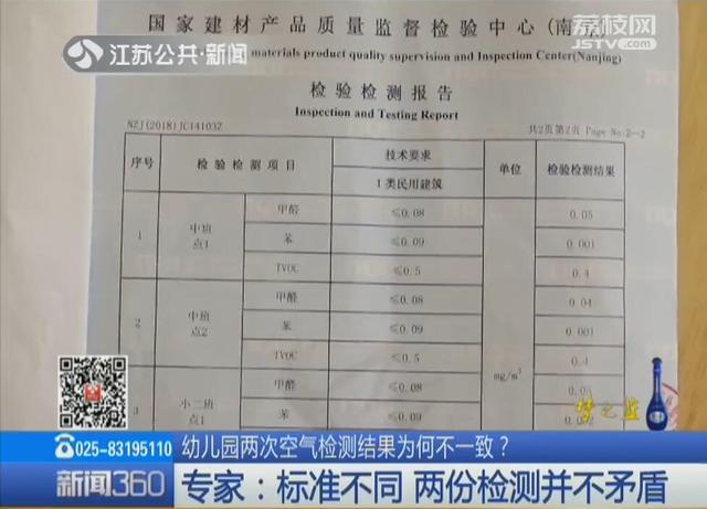 那么,为何家长的检测报告与园方出具的检测报告有出入呢?记者注意到,在幼儿园方提供的8月14日的这份检测报告中,里面一共对两个教室进行了检测,甲醛、苯、TVOC的检测结果均合格。依据是GB 50325-2010《民用建筑工程室内环境污染控制规范》。该规范规定在检测前至少关闭门窗1小时以上。