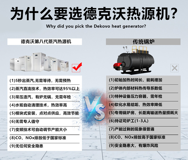 德克沃蒸汽热源机是中国机械工业联合会科学技术鉴定成果,并顺利入选《国家工业节能技术推荐目录》,是国家工信部推荐节能设备;产品由上海工业锅炉研究所测试环评,环保系数高,节能效益好,是上海市节能工程技术协会推荐产品; 蒸汽热源机采用新型的“直流蒸汽发生技术”,使自来水高速流经热交换后,瞬间气化形成蒸汽,颠覆传统蒸汽锅炉“储水-加热-沸腾-产生蒸汽”的工作过程。从开机到蒸汽产生,过程仅需5秒左右。德克沃蒸汽热源机从第一代发展到第七代产品,引领了“蒸汽热源”在我国的推广普及,是蒸汽热源领域的缔造者与倡导者。11大核心技术和8重系统保护装置的应用,使设备更高效,环保,节能。受到广大用户的一致好评,成为新型替代工业锅炉的高科技产品。蒸汽热源机广泛应用于工厂、宾馆、酒店、企事业单位、大型院校食堂、医院医药行业等......德克沃蒸汽热源机采用新型的“直流蒸汽发生技术”,使自来水高速流经热交换后,瞬间气化形成蒸汽,完美颠覆传统蒸汽锅炉“储水-加热-沸腾-产生蒸汽”的工作过程。从开机到蒸汽产生,过程仅需5秒左右。 文案2 德克沃低氮蒸汽热源机代替锅炉出蒸汽, 国家工业节能技术目录推荐设备。更环保,安全,节能。详询 王婷:15366730303 江苏德克沃节能科技有限公司是一家集研发、生产和销售、工程施工、售后服务一体化的高科技创新型企业,以蒸汽为核心热源,为蒸煮、热水、供暖、工业等行业提供综合节能服务,为用户提供综合节能适合的配套解决方案。作为江苏省招商引资正式落户泰州,是江苏省重点引进项目。公司坚持以持续技术创新为客户不断创造价值,研发团队凭多年的供暖、供热、供蒸汽等从业背景,潜心实验、研发改进,推出的蒸汽热源设备等系列产品,采用模块化设计,具有分布式就近安装、自动化控制、节能、安全、易维护、无需专人值守、无需年检等多项优势,比传统蒸汽设备、锅炉设备综合运行节能30%左右。产品广泛地应用于大型医院、餐饮、酒店;学校及企事业机关单位食堂;洗涤熨烫、食品加工、农业育种、工业蒸汽;医疗器械高温消毒、酿造闷蒸、洗浴等方面。德克沃本着认真做事,始于细节的原则,秉着诚信为基、品质为本、健康快乐的企业文化,实现还蓝天梦的伟大信念,愿与各界助推蓝天梦的有识之士携手创造共赢! 一、产品介绍(一)蒸汽热源机原理蒸汽热源机替代了传统蒸汽设备“储水-加热-水沸腾-产生蒸汽”的工作原理和工作过程。蒸汽热源机运用新型的“直流蒸汽发生技术”,使自来水高速流经燃烧室就瞬间将水转化成蒸汽,从而减少了传统蒸汽设备“储水-加热-水沸腾”的过程和环节,从开机到蒸汽产生的整个过程在5秒左右完成。(二)蒸汽热源机性能1、环保指标高标准达标排放,氮氧化合物排放远低于国家标准。2、彻底改变了传统锅炉的冷水加热高温蒸汽的传统工艺,而是有炉无锅,直接将净化水雾化高温加热五秒钟出蒸汽,大幅度缩短了水变蒸汽的时间,大幅度降低了燃料消耗,大幅度降低了生产成本。3、常压造汽,有炉无锅,安全性高,无爆炸危险,非压力容器,无需报批,无需年检,无需专人值守,无需除垢,可直接点对点供到设备。4、智能控制,按需供能,既无大马拉小车的能源浪费,又克服了小马拉大车的能源不足,真正达到按需供能,行为节能的智能化。5、模块化组合,按供能需求量配置,无需供能配置超出率,设备体积小,噪音小,效率高,占地面积小,安装、维修方便快捷。6、适用范围广,适合各类项目供暖,供热水,适合各类企业供蒸汽配套。7、蒸汽热源机的应用可大幅度降低综合运行成本30%左右。 代理政策1.代理商必须为正规注册公司,具有独立法人资格,具有合法的经营资源和固定的经营场所,具有良好的商业信誉及经济实力2.代理商在本区域有一定相关的行业客户资源有强大的市场开拓能力,能承担本区域内的营销任务3.训练有素的销售队伍,至少一名专职营销人员,负责本公司产品销售4.接受甲方的授权并能严格遵守甲方有关代理政策、条例,在甲方指定区域内独家代理甲方的产品和服务。