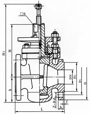 主要外形尺寸公称通径DN(mm)尺寸(mm)LDD1D2□Sz-φdH150170160125100324╳φ1831565220180145120364╳φ1836080250195160135464╳φ18455100300215180155508╳φ18500125350245210185558╳φ18510150400280240210608╳φ23605200450335295265608╳φ237602505303903503208512╳φ2380030058044040036810012╳φ23820