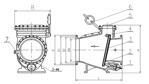 4.工作原理:微阻缓闭消声止回阀主要由阀体、阀盖、阀瓣组件、活塞组件、针型阀(微量调节阀)、重锤组成。靠进口介质的推力作用,将阀瓣自动推开,当阀瓣全开后,平衡锤倒向阀瓣的反面,起到了平衡部份阀瓣重量的目的,减少了因阀瓣重量对水流的压力(阻力)。另外阀体内的压力水通过针型阀流进活塞的后腔,将活塞全部推入。当水流突然停止时(电机断电),由于阀瓣的部分自重和倒流水的推力作用,使阀瓣自动关闭,但是由于活塞杆处于顶端位置,使闪瓣不能全部关闭,还剩有20%(可调节)左右的面积使水流通过,减弱了水锤压力。阀瓣的尖端压在活塞顶上,而活塞后腔的水阻碍活塞退回,亦即阻止阀瓣关闭,这股水只能通过针型阀缓缓流回阀体,使阀瓣缓缓关闭。阀瓣分成快速和缓慢两步关闭,达到了既防电机逆转又减弱水锤的作用。活塞杆伸出的长短决定了阀瓣缓闭的开度。越长则缓闭开度大,水锤小,但延长关闭时间,反之越短则缓闭开度小,会产生破坏性水锤。为此开度调节杆⑴应慎重调整。管路的长短决定水锤峰值的周值。为了适应各种系统的缓闭时间的要求,本阀侧面安装了一针型阀(微量调节阀)⑺,可根据水锤峰值到来的时间长短,产生水锤的大小和水泵倒转速度等,准确的控制活塞后腔压缩水的流量,也就是控制阀瓣缓闭时间,这个时间可以在0~60秒内任意调节。