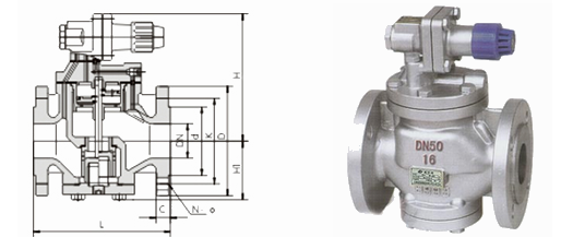 我公司YG43H/Y减压阀属于先导活塞式减压阀。由主阀和导阀两部分组成。主阀主要由阀座、主阀盘、活塞、弹簧等零件组成。导阀主要由阀座、阀瓣、膜片、弹簧、调节弹簧等零件组成。通过调节调节弹簧压力设定出口压力、利用膜片传感出口压力变化,通过导阀启闭驱动活塞调节主阀节流部位过流面积的大小,实现减压稳压功能。