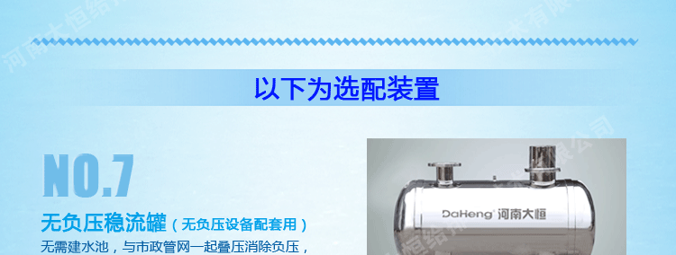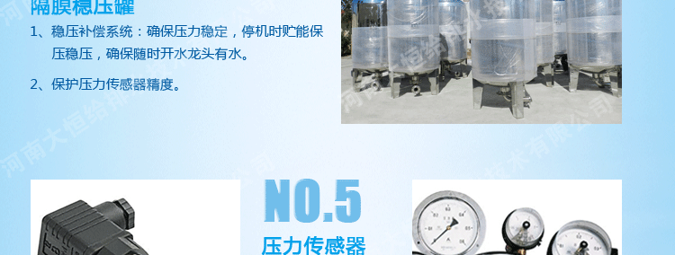 二次加压供水设备主要由水泵机组、隔膜稳压罐(可选)、压力传感器、变频控制箱(柜)、阀门管件等组成,能始终保持恒压(即用户管网水压)等于用户设定值。