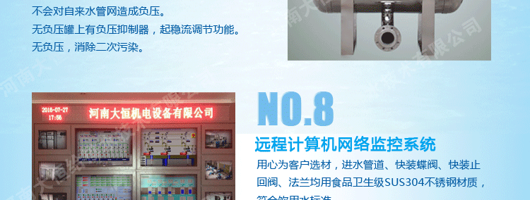 水箱备有足够的水源,避免用水高峰时水源不足。水箱及管件、管路均为食品级不锈钢制品,避免二次污染及年久腐蚀损坏。