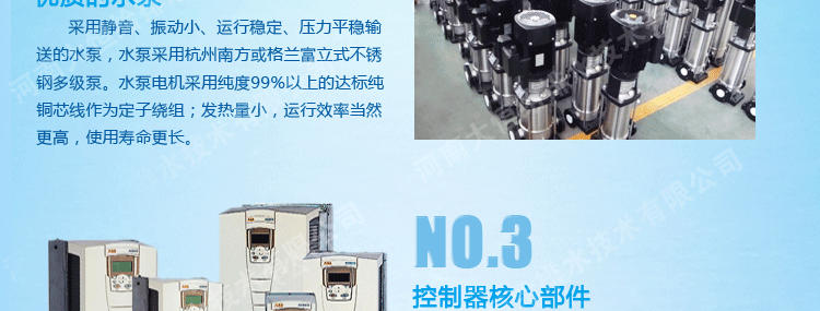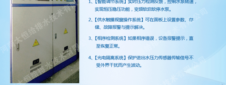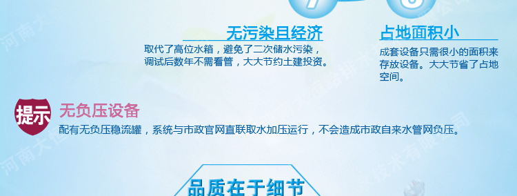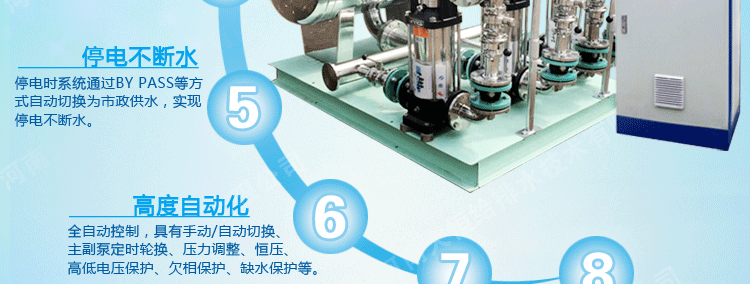 适用于具有自来水管网,需要增高水压、调节流量的给水系统,可作为城乡建筑小区、商务楼、宾馆等场所二次加压供水使用,产品具有外形美观,安装简捷,节资节能,变频控制,选材严格等特点。产品的卫生安全性符合《生活饮用水输配水设备及防护材料卫生安全评价规范》标准的要求,该产品节能、环保,同时又避免了二次供水污染等特点,是一种理想的二次供水设备。