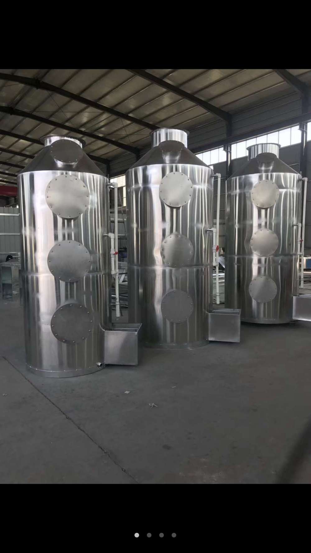 本设备分单塔体和双塔体。采用圆形塔体,用法兰分段联接而成。具体由贮液箱、塔体、进风段、喷淋层、填 料层、旋流除雾层、观检窗、出风口等组成。该酸雾净化塔是圆形塔体,用聚丙烯、聚氯乙烯等材料由法兰连接分段制作而成。具体结构由进风段、压力室、鼓泡贮液箱、两级喷淋段、旋流板、出风锥帽、风管、风道、液体流量计、液位计、压力检测口、酸缄度仪等组成。酸雾净化塔它具有效力高、耐腐蚀性强,高强度、低噪声、耗电省,拆装维修方便,