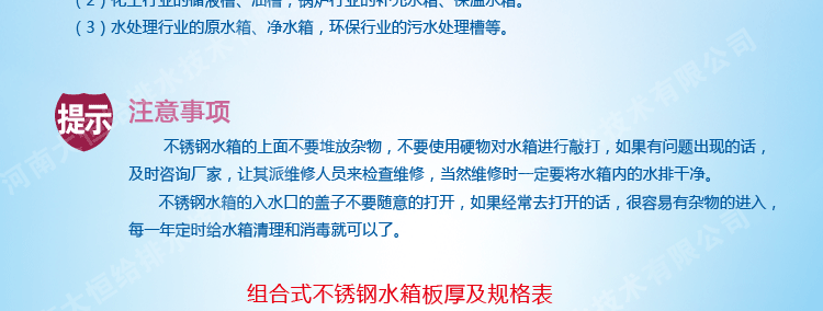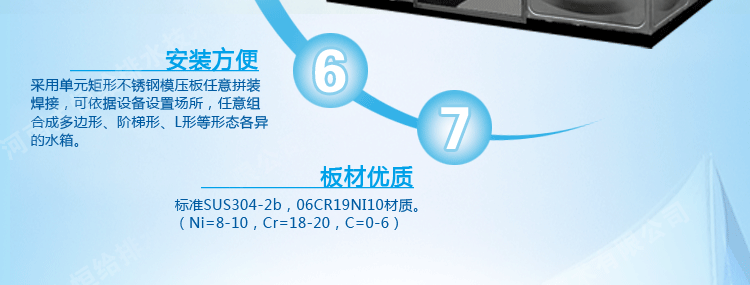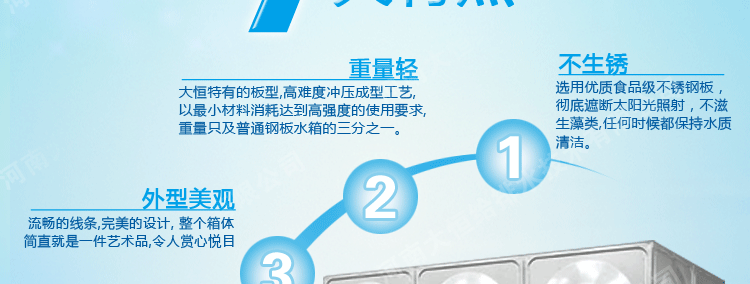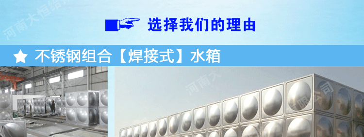 大恒生产不锈钢水箱是二次水容器的一次革命,采用SUS304不锈钢板做的水箱完全符合国家卫生食品级标准。不锈钢水箱代替水泥水箱、铁板水箱、玻璃钢水箱是必然的趋势,而且不锈钢水箱卫生无毒、耐蚀性强、内部不滋生藻类,任何时候都保证水质清洁,也是优质的环保产品。