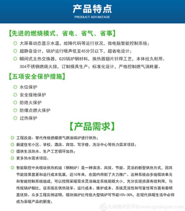 先进的燃烧模式,省电、省气、省事。一 人机界面动态显示水温,故障自检处理,可编程控制系统。
