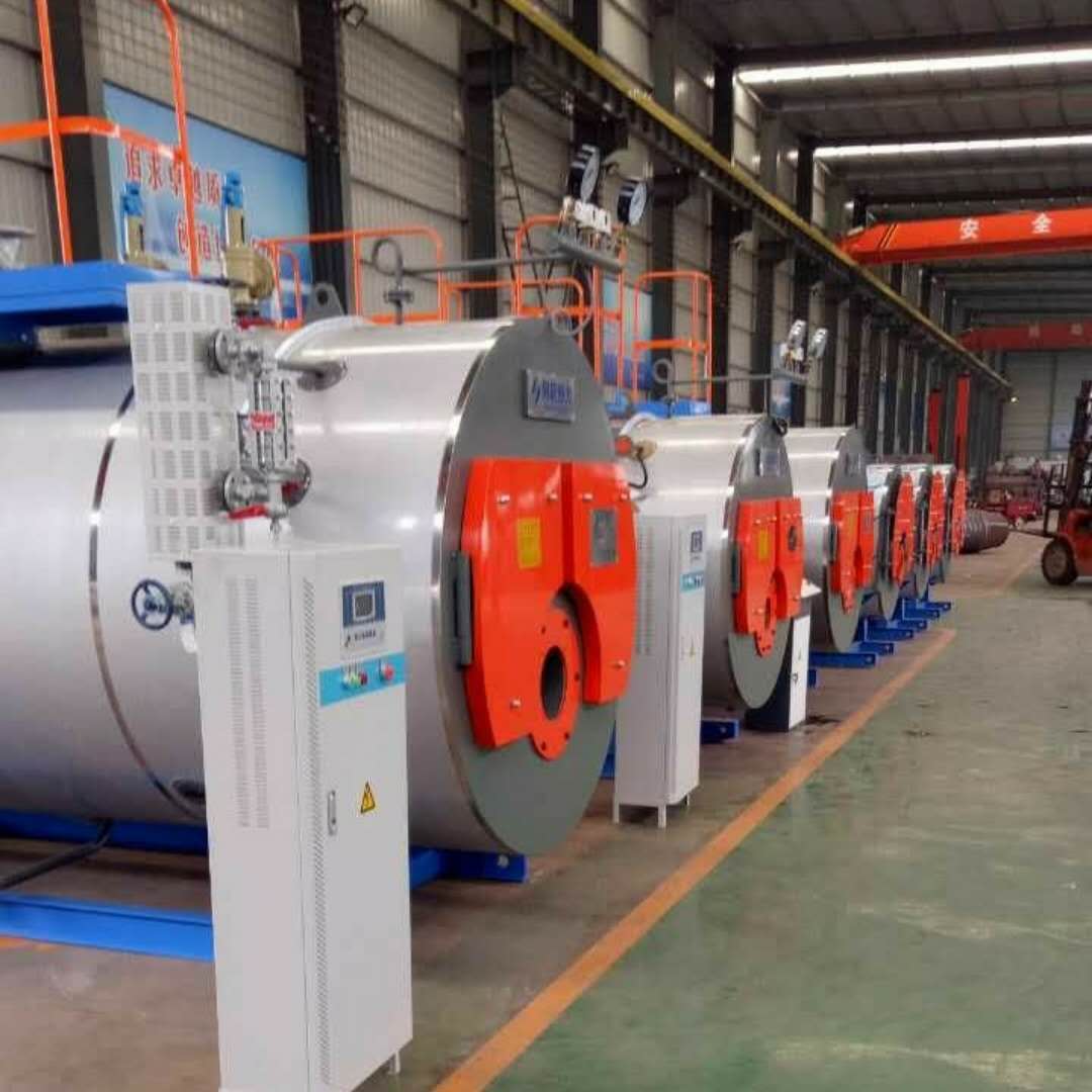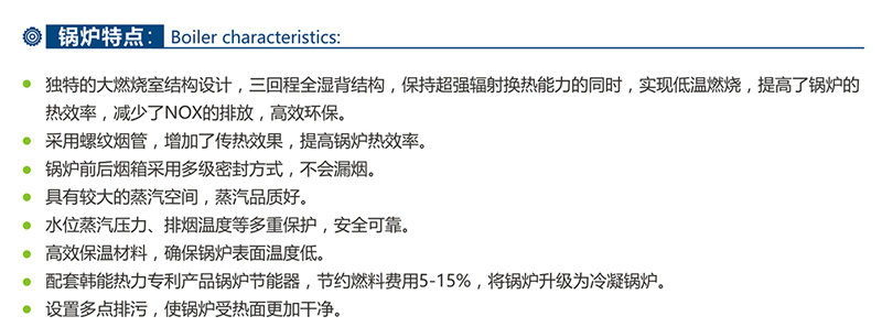 WNS系列全自动低氮燃气蒸汽锅炉采用卧式三回程湿背结构,改善锅炉运行环境,提高锅炉效率和使用寿命;全部烟气通道置于水中,尾部配有翅片管冷凝器及完善的保温外包设计,烟箱密封采用迷宫式结构,避免了烟箱漏烟现象;内、外筒拥有良好膨胀性能的波纹炉胆与锥形炉胆的组合炉胆,炉胆尺寸与火焰扩散相结合,烟气流通面积依次减小,使烟气等速流动,保证高温烟气在炉内的热交换时间,达到优良的传热效果;使用冷凝器装置的热效率高达90%以上;微单片机智能控制优化点火,燃烧状态自动调节,使燃烧更充分,更节省燃料,低Nox排放降低污染;智能化节能控制系统,对锅炉及供汽(供水)系统进行控制,结合不同负荷调节燃料供给,更加节能;安装方式为整体快装锅炉,振动小,对地基无特殊要求,不需地脚螺栓固定,安装简单易行。 采用活动炉头结构,可匹配各种燃烧器,更换炉头,维修炉体方便快捷;前、后烟箱采用活动可拆结构,可方便地对锅炉内部进行检查、维护、保养,简单、便捷,产品设计新颖、结构合理,工艺性能良好,使本产品具有不同凡响的优异品质,全系列产品应用原装低氮燃烧机,降低了40%的CO2和NOx等污染物,是全世界的环保领先技术锅炉。主要特点1、锅炉的设计、生产制造、监督检验均严格按《蒸汽锅炉安全监察规程》、JB/T 10094-2002《工业锅炉通用技术条件》、JB/T 1619-2002《锅壳锅炉本体制造技术条件》执行,确保锅炉长期安全稳定工作。2、本体为锅壳式全湿背顺流三回程烟火管结构,火焰在大燃烧室内微正压燃烧,完全伸展,燃烧热负荷低,有害物质NOx排放量少,同时受热面积的优化利用,根据炉膛换热量和温度的4次方成正比的原理,有效辐射受热面大,炉膛辐射吸热量占总吸热量的比例高。3、波形炉胆及螺纹烟管结构,即提高了强度,又满足了各部分受热膨胀的需要。4、主焊缝焊接均采用对接连接,并经X射线及超声波无损探伤,确保焊接质量达到蒸规要求。5、锅炉水容积及气空间大,适应负荷能力强。设计合理的锅内装置,蒸汽带水率低,满足用户对蒸汽品质的较高要求。6、采用新型隔热保温材料,重量轻,散热损失少,保温性能好。7、水位报警器采用不锈钢传感器,聚四氟乙烯作绝缘材料。从上方插入,不易挂污,性能可靠,使用寿命长。8、前后烟箱为铰链连接,可轻松打开,检修维护维护方便快捷。9、氧含量调节(选配):该功能监测烟气中的含氧量,并实时将该数据传送到控制系统中,通过计算机智能分析,自动调整燃烧设备的配比,使其实时处在最佳的工作状,燃烧效率大大提高,从而可大幅降低燃料的消耗。