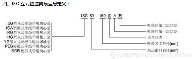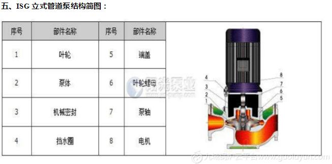 一、ISG立式管道泵产品概述: ISG立式管道泵,是本单位科技人员联合国内水泵专家选用优秀水力模型,采用IS型离心泵之性能参数,在一般立式泵的基础上进行巧妙组合设计而成。同时根据使用温度、介质等不同在ISG型基础上派出适用热水、高温、腐蚀性化工泵、油泵。该系列产品具有高效节能、噪音低、性能可靠等优点。 二、ISG立式管道泵产品特点: 1、泵为立式结构,进出口口径相同,且位于同一中心线上,可象阀门一样安装于管路之中,外形紧凑美观,占地面积小,建筑投入低,如加上防护罩则可置于户外使用。 2、叶轮直接安装在电机的加长轴上,轴向尺寸短,结构紧凑,泵与电机轴承配置合理,能有效地平衡泵运转产生的径向和轴向负荷,从而保证了泵的运行平稳,振动小、噪音低。 3、轴封采用机械密封或机械密封组合,采用进口钛合金密封环、中型耐高温机械密封和采用硬质合金材质,耐磨密封,能有效地延长机械密封的使用寿命。 4、安装检修方便,无需拆动管道路系统,只要卸下泵联体座螺母即可抽出全部转子部件。 5、可根据使用要求即流量和扬程的需要采用泵的串、并联运行方式。