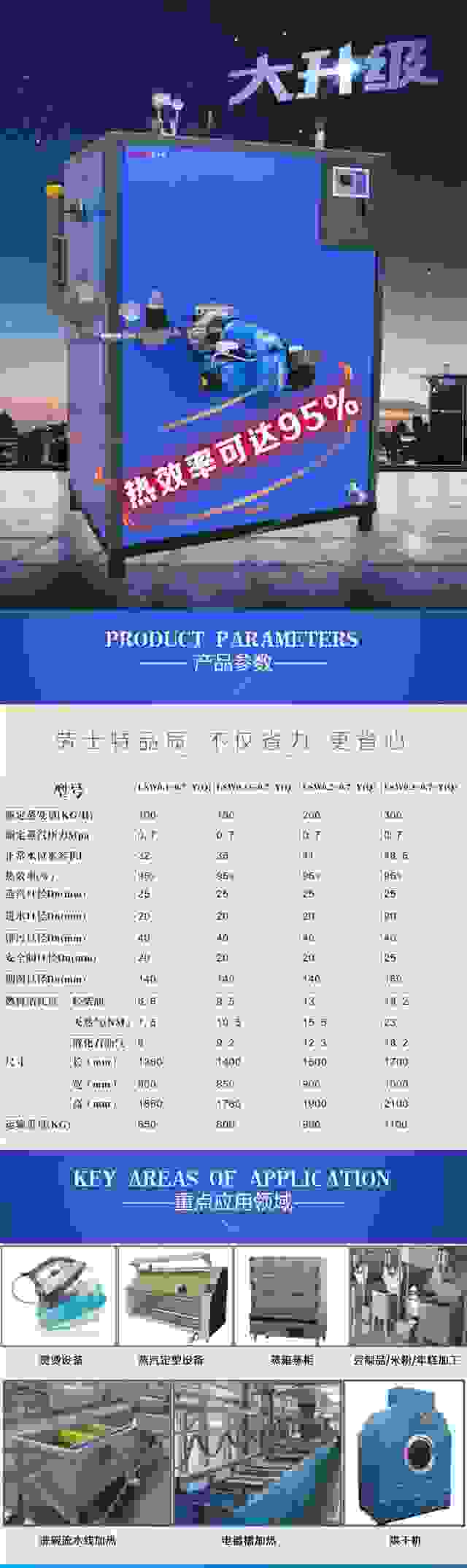 食品加工行业:豆腐机、米粉机、凉皮机、蒸箱、灭菌罐、包装机、涂装设备、封口机等设备配套使用,酒店、企业事业单位食堂及各种服务站消毒、蒸菜、蒸饭供应开水