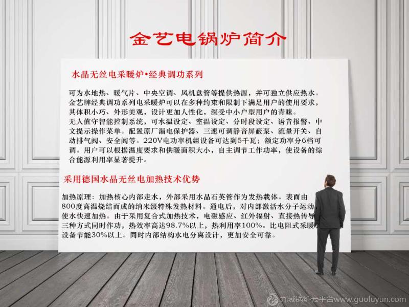 可为水地热、暖气片、中央空调、风机盘管等提供热源,并可独立供应热水金艺牌经典调功系列电采暖炉可以在多种约束和限制下满足用户的使用要求,其体积小巧、外形美观,设计更加人性化,深受中小户型用户的青睐。无人值守智能控制系统,可水温设定、室温设定、分时段设定、语音报警、中文提示操作菜单。配置原厂漏电保护器、三速可调静音屏蔽泵、流量开关、自动排气阀、安全阀等。220V电功率机组设备可达到5千瓦;额定功率分4档可调。用户可以根据温度要求和供暖面积大小,自主调节工作功率,使设备的综合能源利用率显著提升。采用德国水晶无丝电加热技术优势