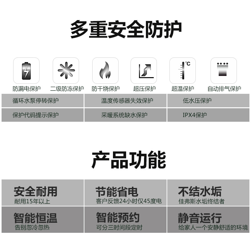 4.三段定时功能,自动防冻功能,双极温控防干烧功能,防水泵抱死功能;