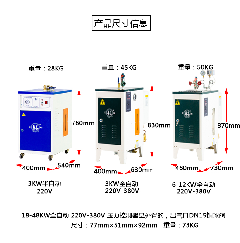 安全:自动供水、发热系统故障全自动保护,采用优质碳素钢制造,经过严格检测; 高效:产汽速度快,气压稳,节电节能; 环保运行:无噪音,无污染,热效率高,锅炉本体采用优质高效保温材料,散热损耗小,热效率大于98%; 方便:体积小,安装和移动方便。整机质保一年,终身免费维修