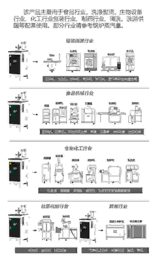 用汽设备、服装整烫、洗涤、食品加工、餐饮、家庭作坊等行业,同时也是学校、医